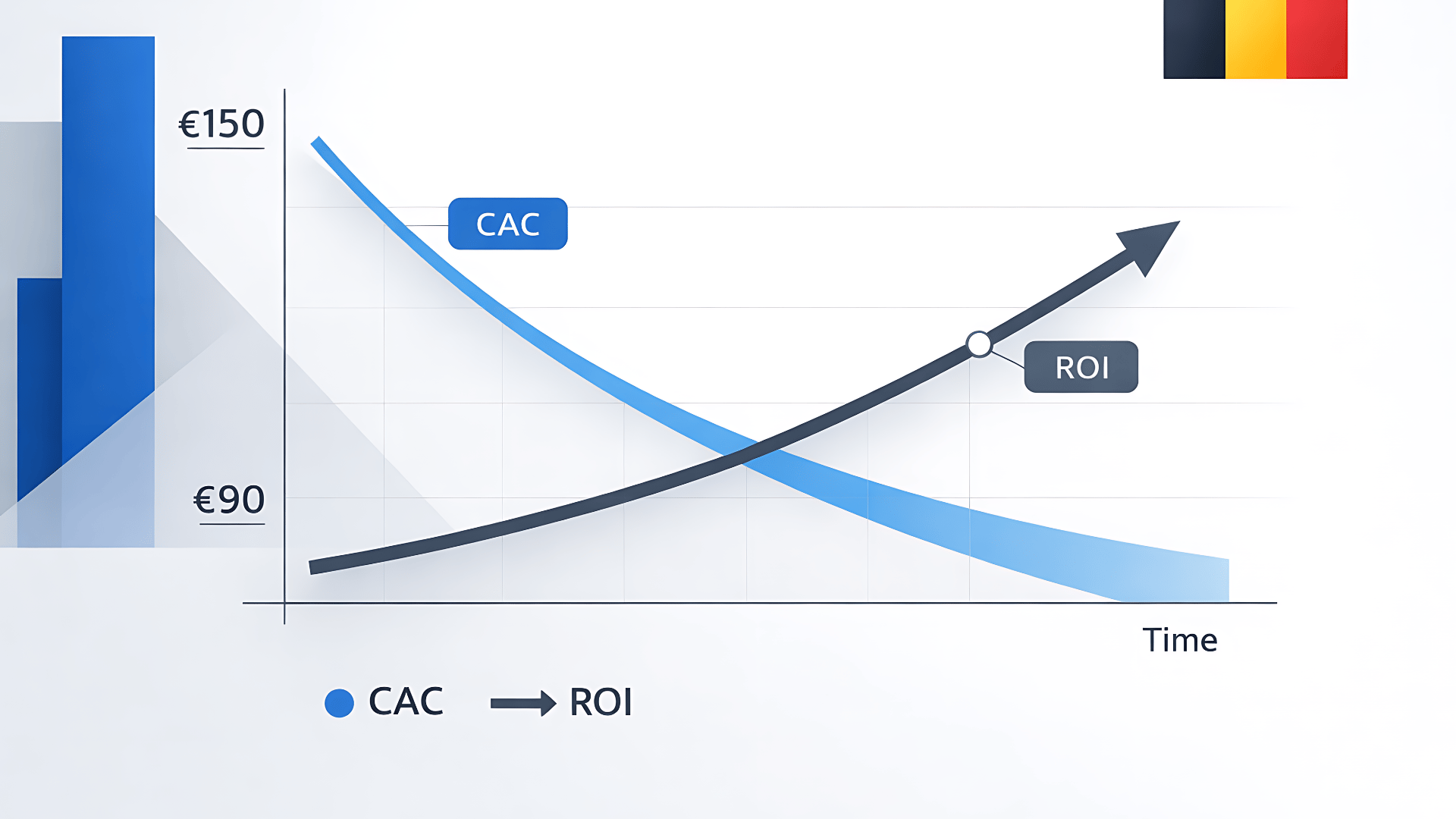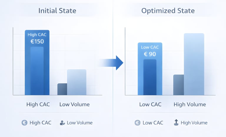 Les premiers gains apparaissent dès le trimestre 1 via l'optimisation des campagnes payantes et l'amélioration des taux de conversion. Le CAC peut passer de 150€ à 110€-120€ en trois mois. Les gains structurels arrivent au trimestre 2 et 3, lorsque le SEO commence à générer du trafic organique qualifié et que le contenu expert produit ses effets. À 12 mois, un CAC sous 90€ est atteignable pour la majorité des entreprises B2B belges disposant d'une marge brute supérieure à 35%.